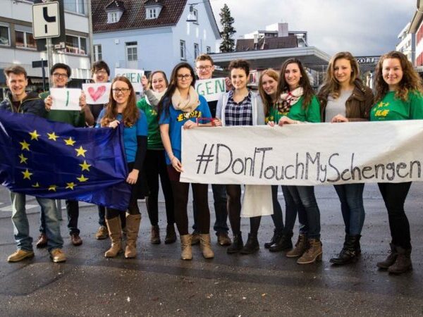 [/vc_column_text][/vc_column][/vc_row] Auch im Netz stellten wir diese Forderung. An der Thunderclap-Kampagne nahmen über 1.300 Menschen teil, darunter auch Abgeordnete des Europäischen Parlaments und der Europäische Wirtschafts- und Sozialausschuss: Open borders are one of Europe’s greatest milestones. Let’s keep it that way. #DontTouchMySchengen https://t.co/sg41sRXBlb Ho appena aderito alla campagna #DontTouchMySchengen, organizzata dagli Young European Federalists, per difendere... https://t.co/F3ricaL8Er Ho sostenuto #DontTouchMySchengen su @ThunderclapIt con @JEF_Europe. Barriere e muri tradiscono l'idea di #Europa. https://t.co/6RcRiYueDh Our commitment #DontTouchMySchengen @gabischoff pic.twitter.com/EDRyorQI6R Alleine auf Twitter erreichte „#DontTouchMySchengen“ mehr als 50.000 Personen. Doch damit nicht genug. Höhepunkt der deutschen Aktionen war ein gemeinsamer Protestmarsch vom deutschen Perl über die Grenzbrücke hinweg ins luxemburgische Schengen. Die JEF Saarland, die JEF Hessen und die JEF Rheinland-Pfalz sowie einige Interessierte marschierten am Sonntagnachmittag – Wetter und Karneval zum Trotz – unter der Leitung des stellvertretenden Bundesvorsitzenden Tilmann Hartung mit Plakaten und lautstarken Forderungen nach Luxemburg. Doch bei der Aktionswoche wird es nicht bleiben. Die offenen Grenzen in Europa sind und werden weiterhin bedroht von nationalstaatlichen Eigeninteressen und irreführender Abschottungspolitik. Der Verlust des Schengen-Raums wäre fatal, nicht nur für Europas Wirtschaft, sondern vor allem für die persönlichen Freiheiten der Bürger und Bürgerinnen. Aber wir werden uns weiter dafür einsetzen, dass unsere Reisefreiheit in Europa erhalten bleibt. Europas Binnengrenzen schließen? – Nicht mit uns.